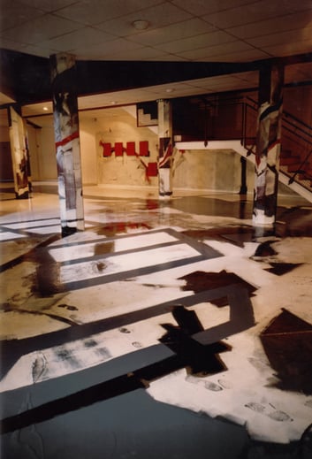 Mon tableau est un lieu ouvert où se joue un théâtre de figures abstraites*, qui ont une énergie, un parcours, un rôle au sein d’actions qui forment une dramaturgie. Structure d’ensemble, ces figures et ces mouvements sont lisibles par le spectateur, par des interprétations inconscientes et acquises, archaïques ou très érudites. Chaque spectateur aura son interprétation de chaque figure (la tache rouge, le carré, la ligne d’horizon, etc…), et des relations dynamiques entre elles, mais il reste que le sens général est donné par l’auteur qui imbrique les figures dans la structure dynamique et en fait une sorte de rébus. Chaque interprétation est comme un calque qui se superpose à la précédente, et la totalité de ces calques constitue le sens de la toile, en filigrane...