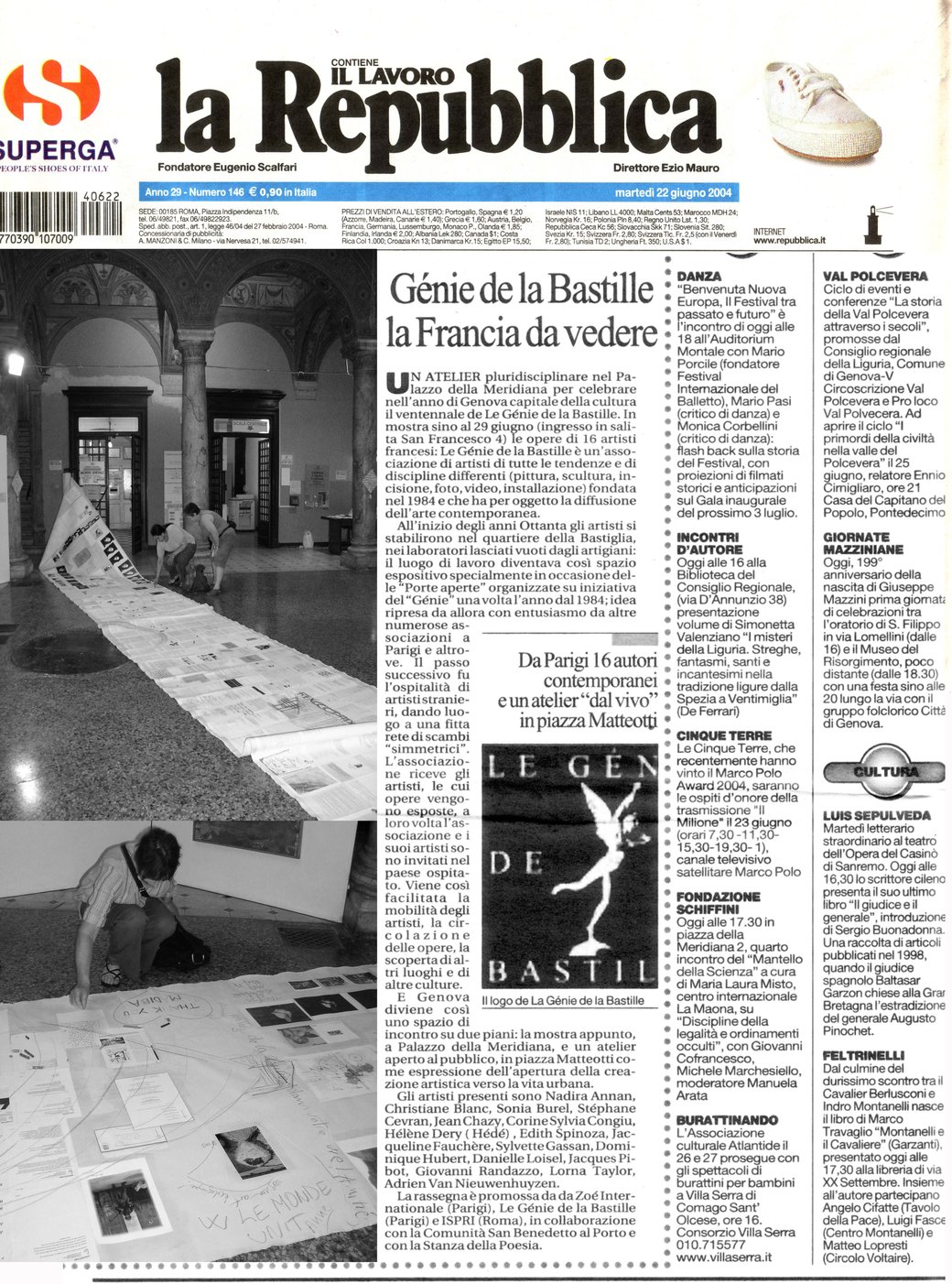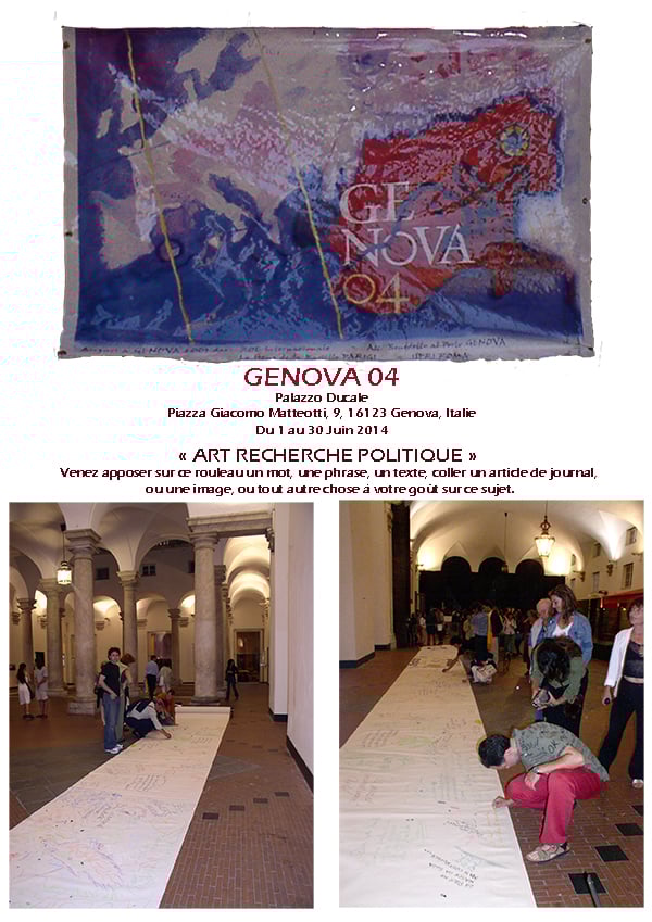 A gauche : Art Recherche Politique, rouleau participatif de Corine Sylvia Congiu au Palazzo Duccale, Manifestation internationale Genova 2004