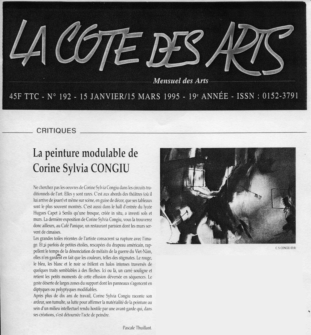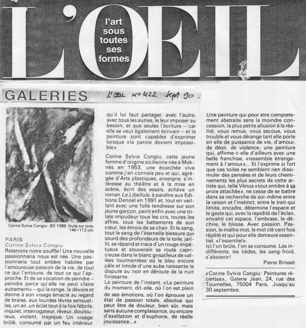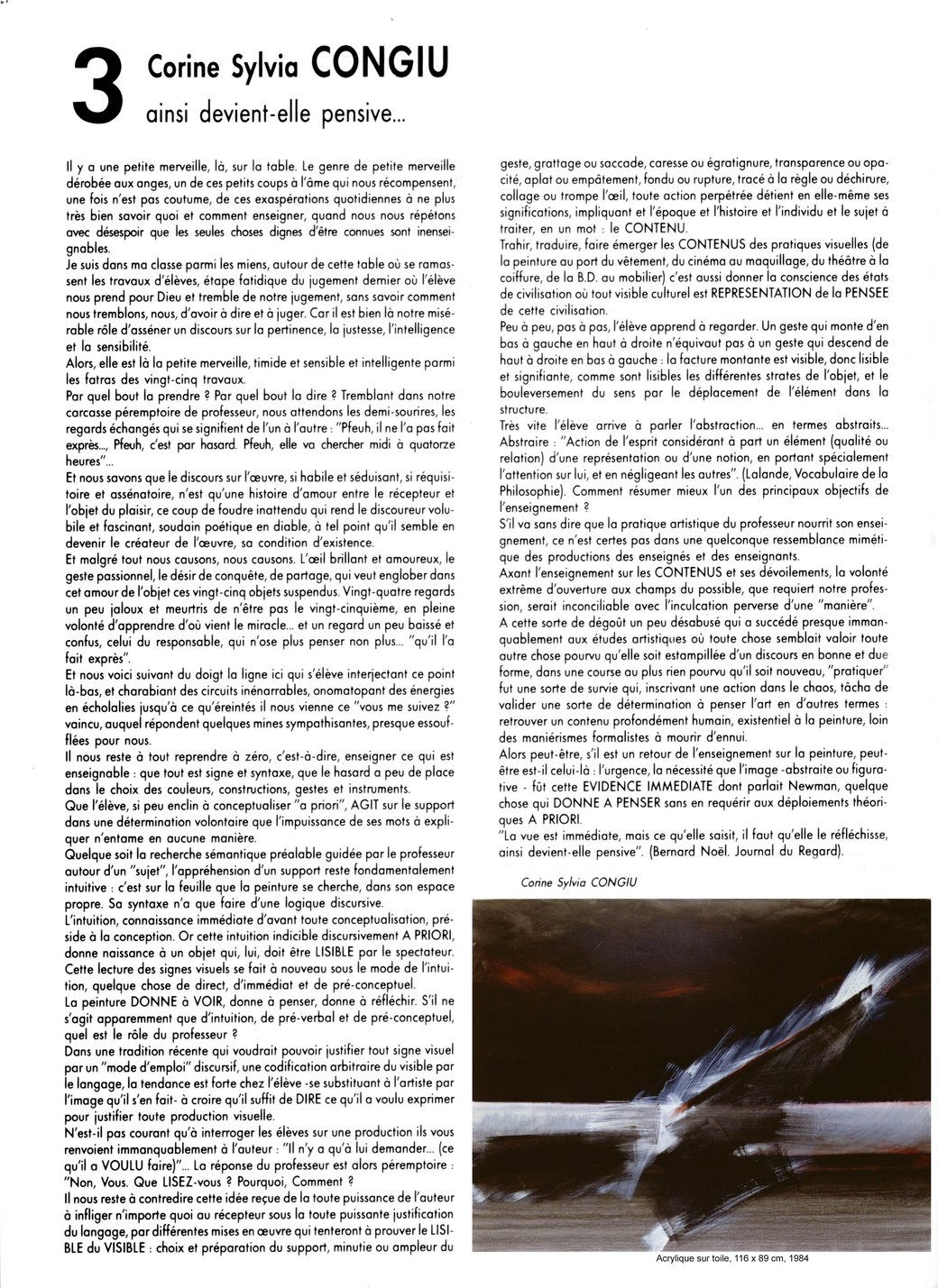 Le tableau (acrylique sur toile, daté du 22 mars 1987 –Sans titre–) de Corine Sylvia CONGIU nous invite à un théâtre d’ombres et de lumières où l’événement créé représente une mise en abîme du visible. Cette œuvre surgit comme d’une radicalité formelle dans un espace matériel dynamisé par un vaste champ blanc qui renvoie toute la lumière.