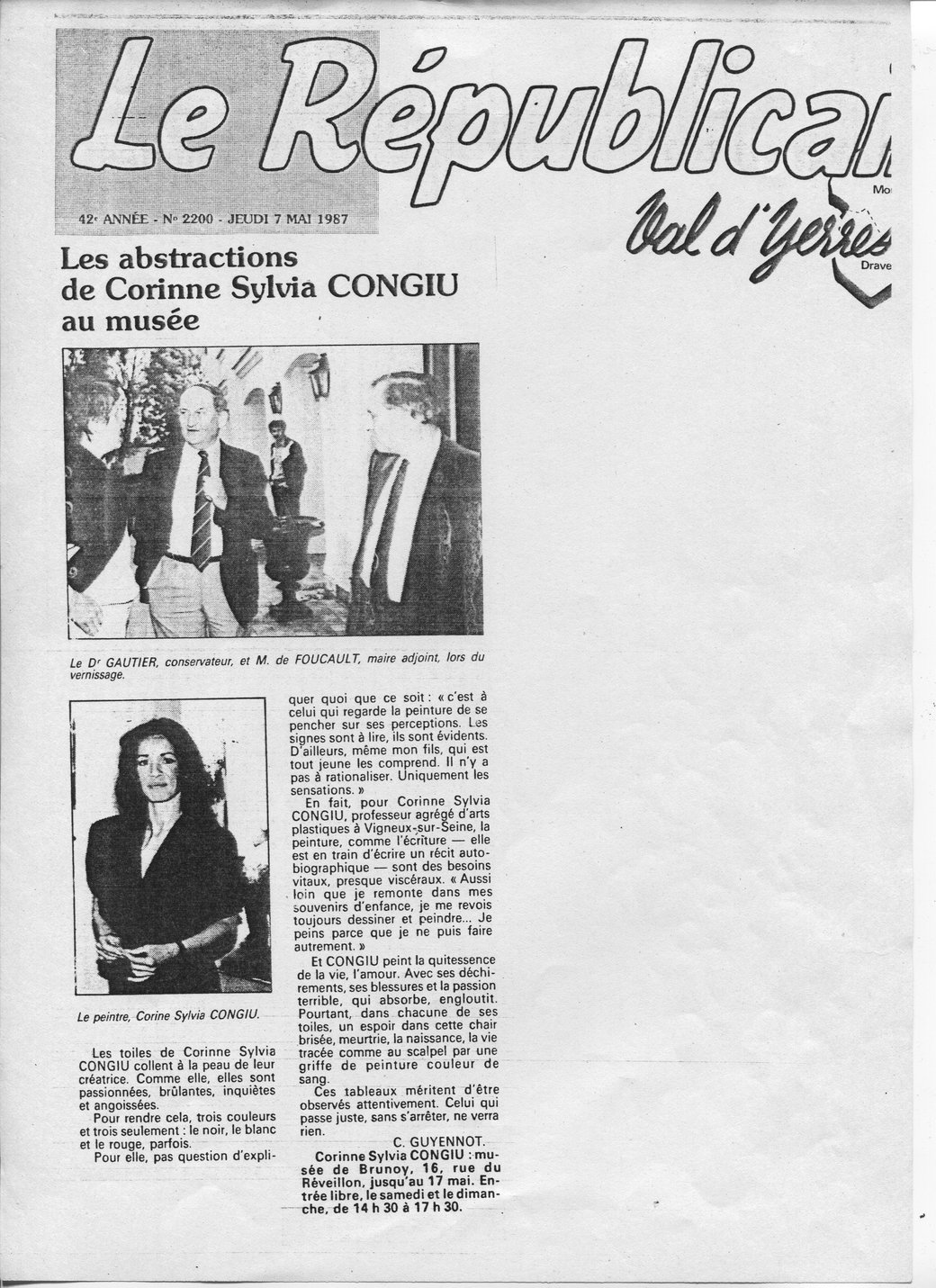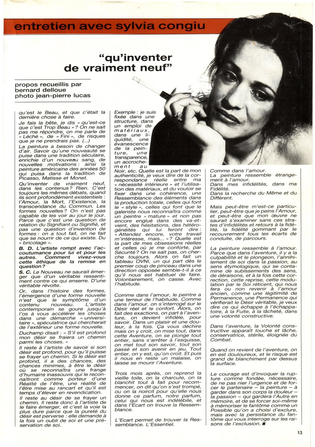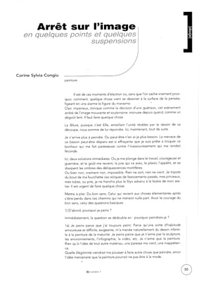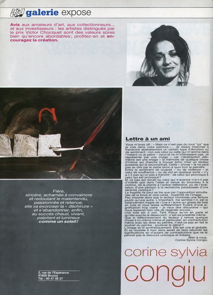 Le tableau (acrylique sur toile, daté du 22 mars 1987 –Sans titre–) de Corine Sylvia CONGIU nous invite à un théâtre d’ombres et de lumières où l’événement créé représente une mise en abîme du visible. Cette œuvre surgit comme d’une radicalité formelle dans un espace matériel dynamisé par un vaste champ blanc qui renvoie toute la lumière.