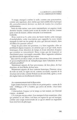 A l’origine, en le contemplant, je fus frappé par l’unique déchirure oblique qui le compose. Cette lente courbe apaisée et apparemment sanglante ne m’interrogeait pas, elle s’imposait comme une ouverture. J’y distinguai l’aperture théâtrale symbolique contenue en le lever de rideau. Cette ondulation aérienne descend résolument pour s’accrocher sur le côté comme se relèverait le pan gauche d’un rideau de scène. La scène apparaît.