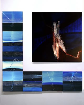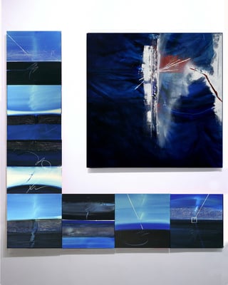4 et 5 : Corine Sylvia Congiu polyptyque bleu 1 toile de 100x 100 7 toiles de 40 x 40 cm