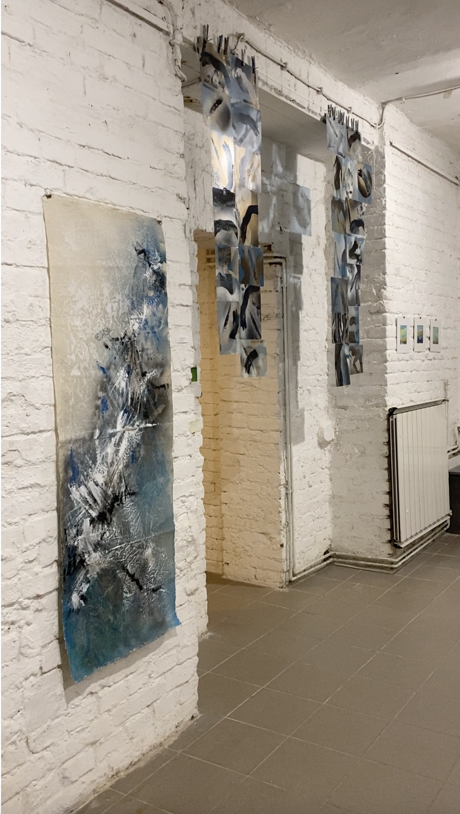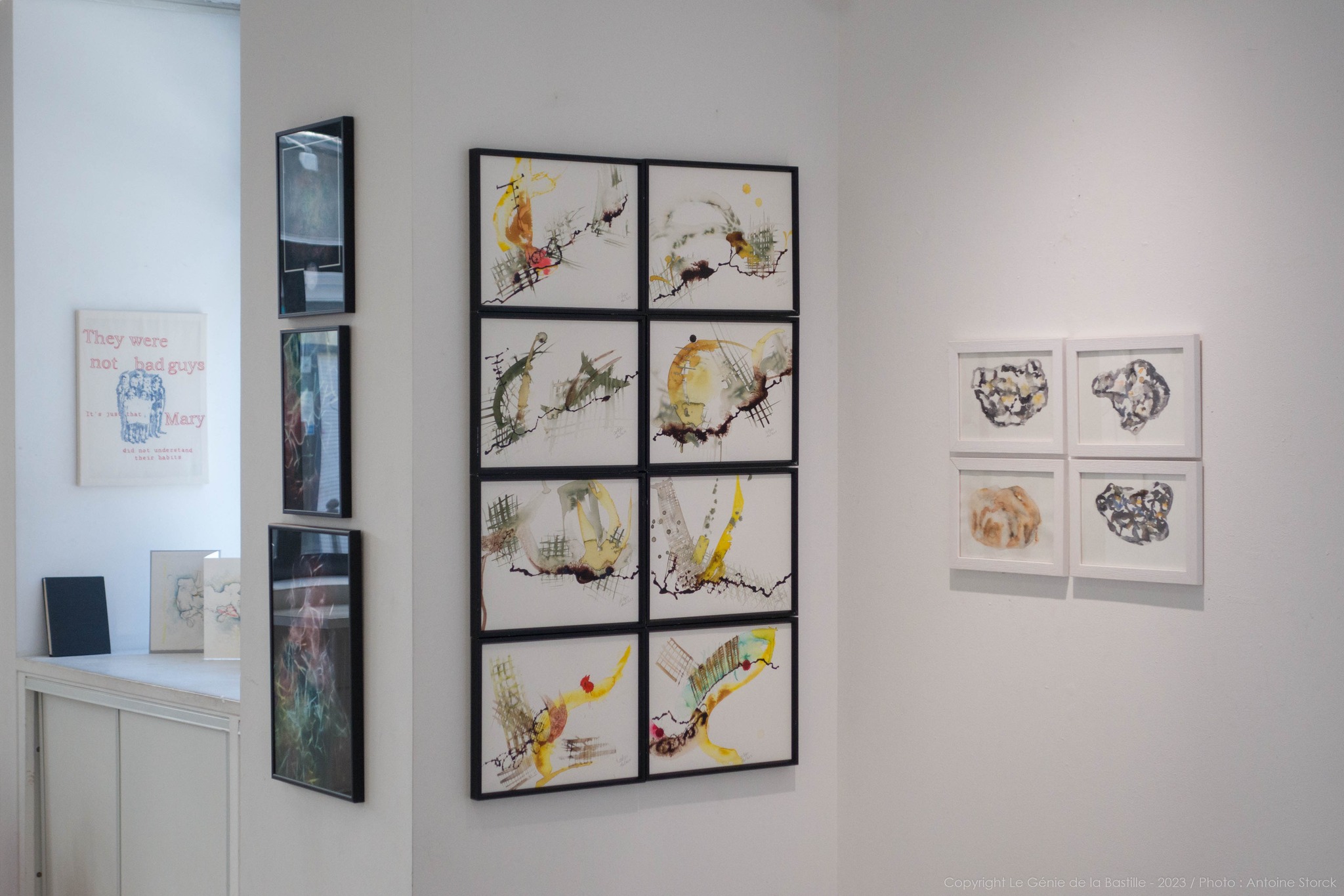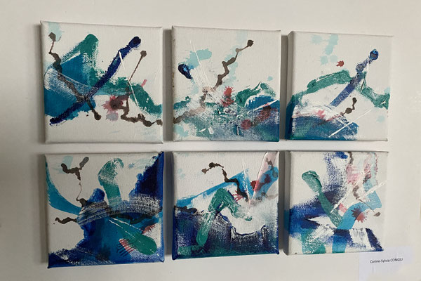 Acryliques sur toiles carrées de 50cm, disposées au-dessus de montages photographiques réalisés à partir d’un dessin de Louise Michel au réalisme photographique, et de documents d’époque en lien avec cette personnalité (Le « chant international » qu’elle a elle-même écrit, le journal « Le cri du peuple » auquel elle a participé, son roman « La misère »…)